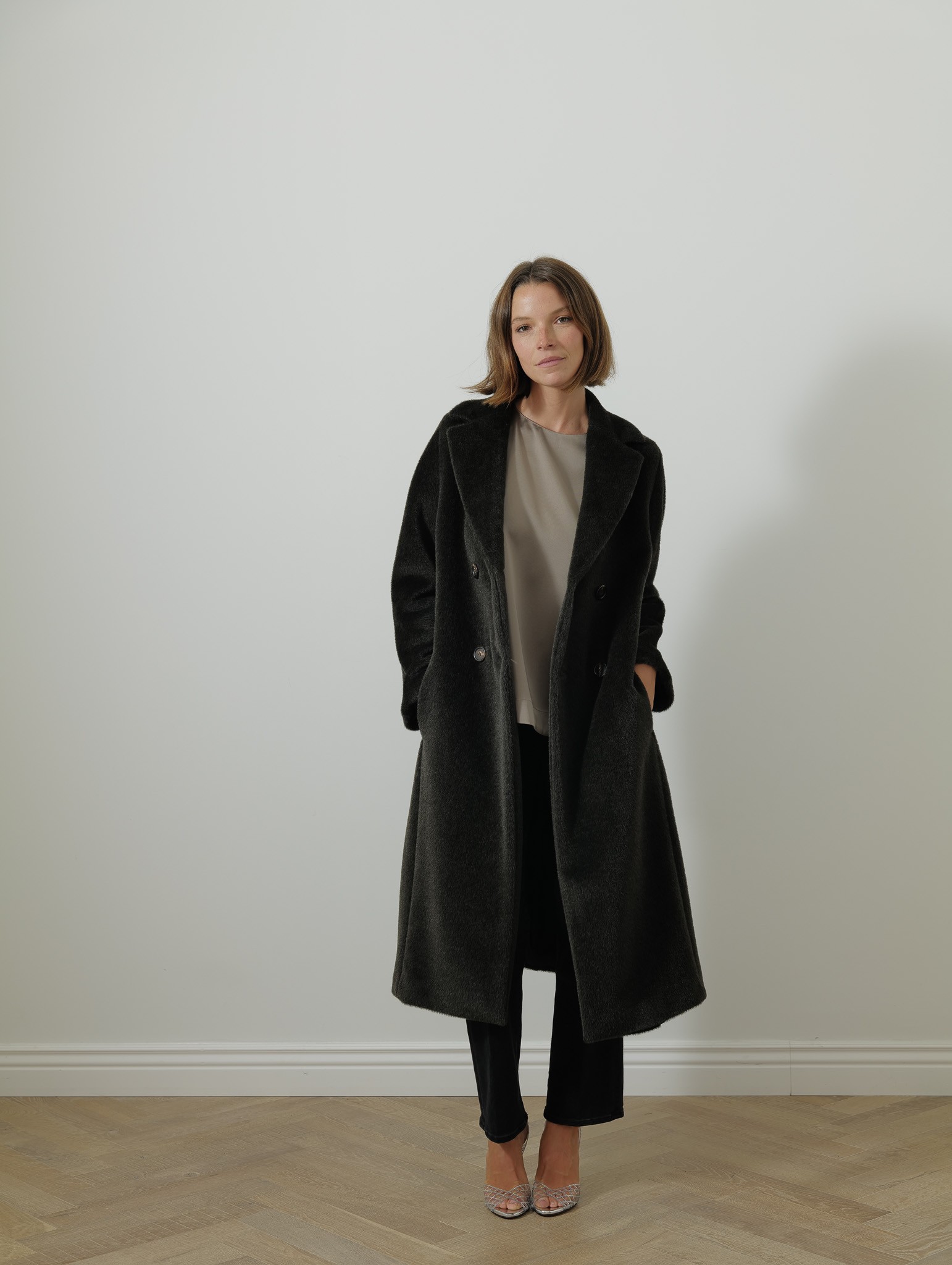Ce manteau long, confectionné dans une matière chaude laine et alpaga, est idéal pour affronter l’hiver avec élégance. Il se distingue par son col cranté, ses manches longues et son double boutonnage, pour un style classique et intemporel.