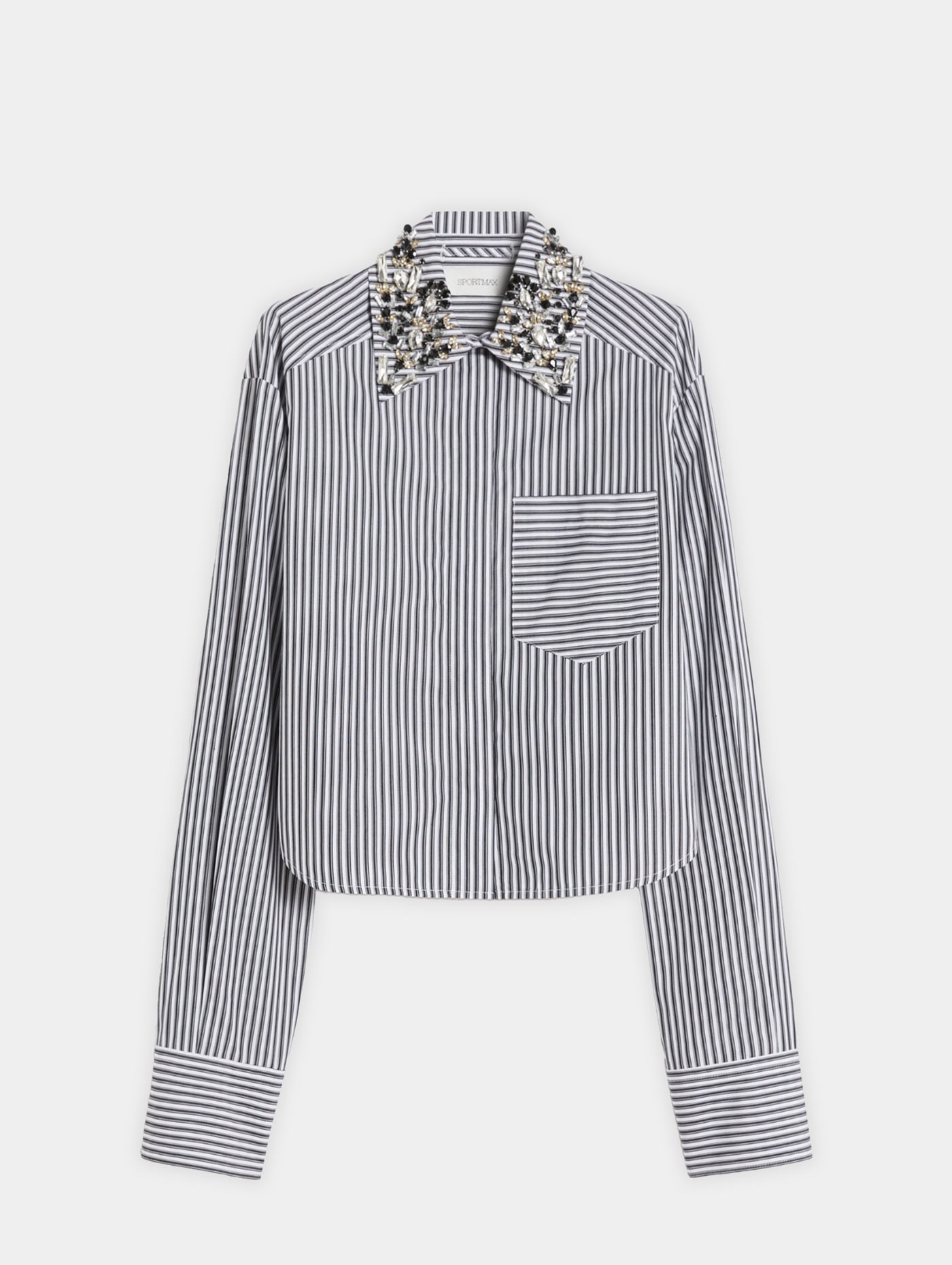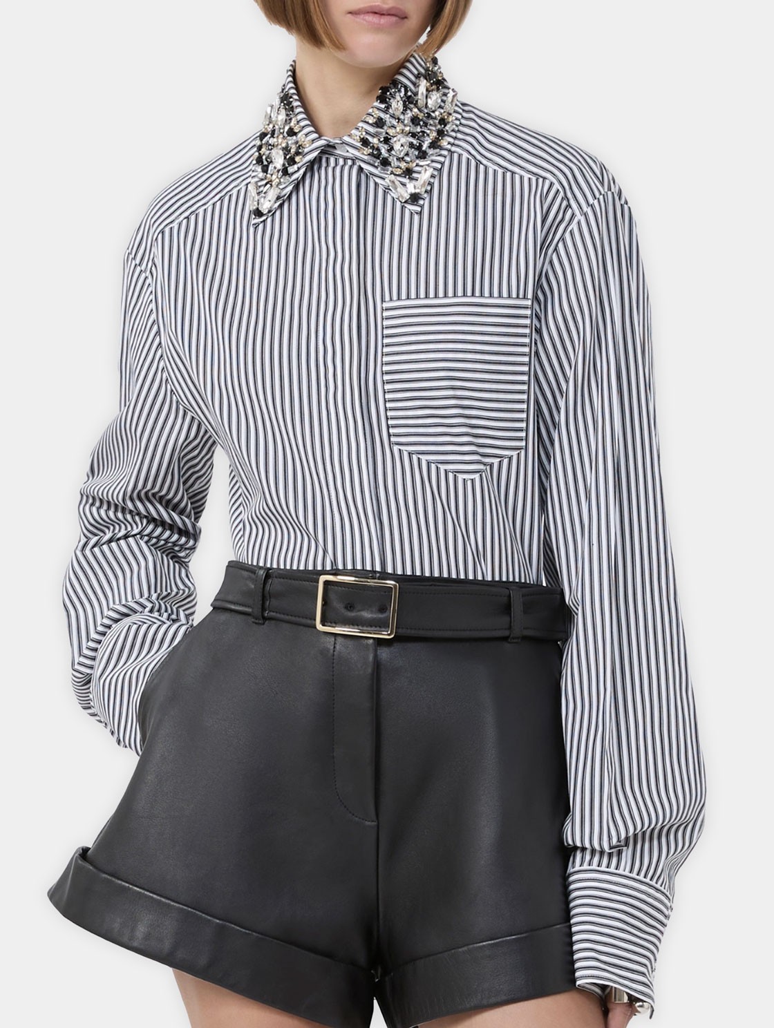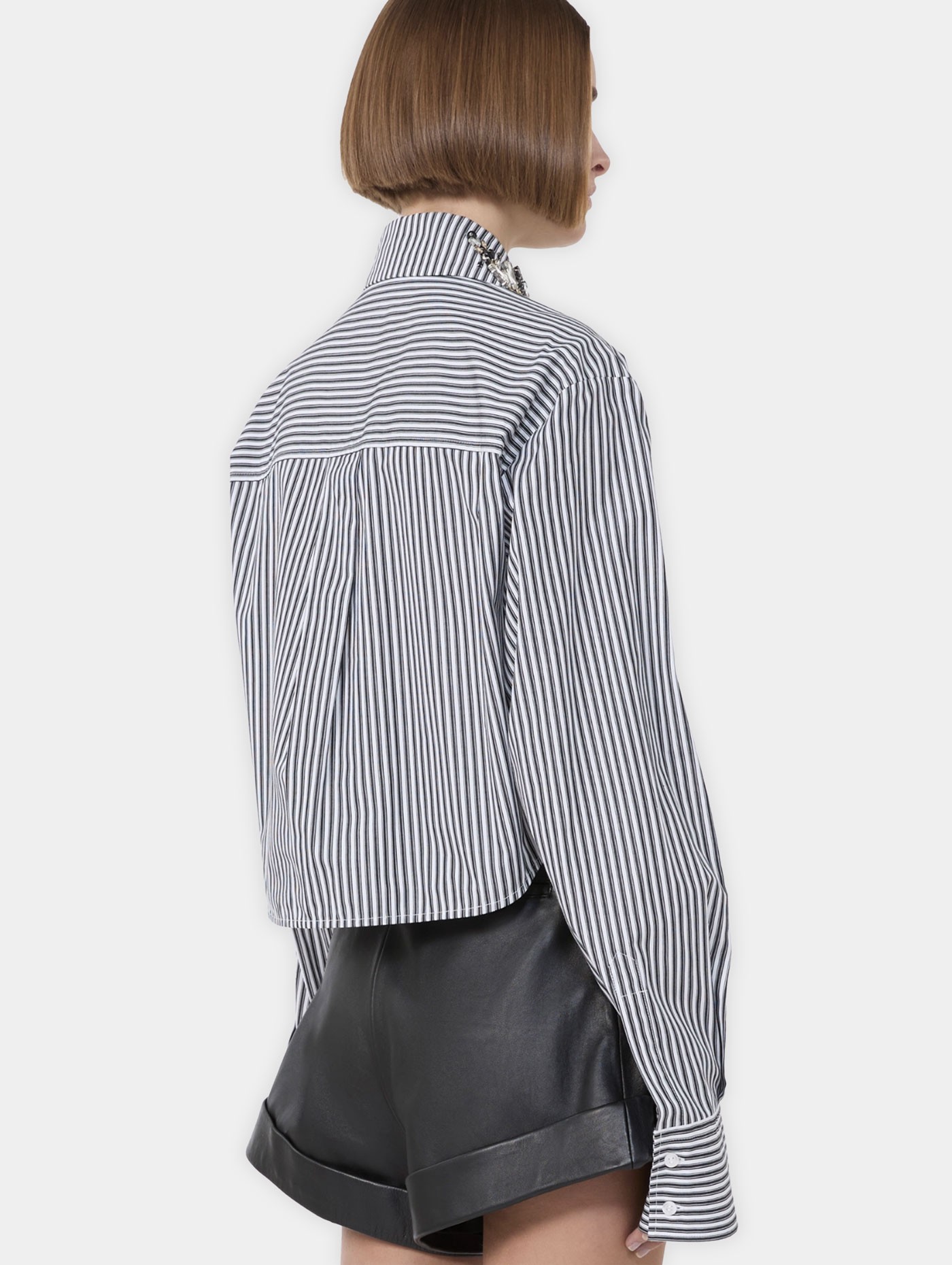 Cette chemise rayée en popeline de pur coton séduit par sa coupe droite légèrement raccourcie et son design épuré. Le boutonnage dissimulé apporte une allure sobre et moderne, tandis que le col chemise agrémenté d’une broderie bijou ajoute une touche raffinée. La poche poitrine plaquée et le bas arrondi complètent cette pièce élégante, facile à porter au quotidien comme dans des silhouettes plus habillées.
