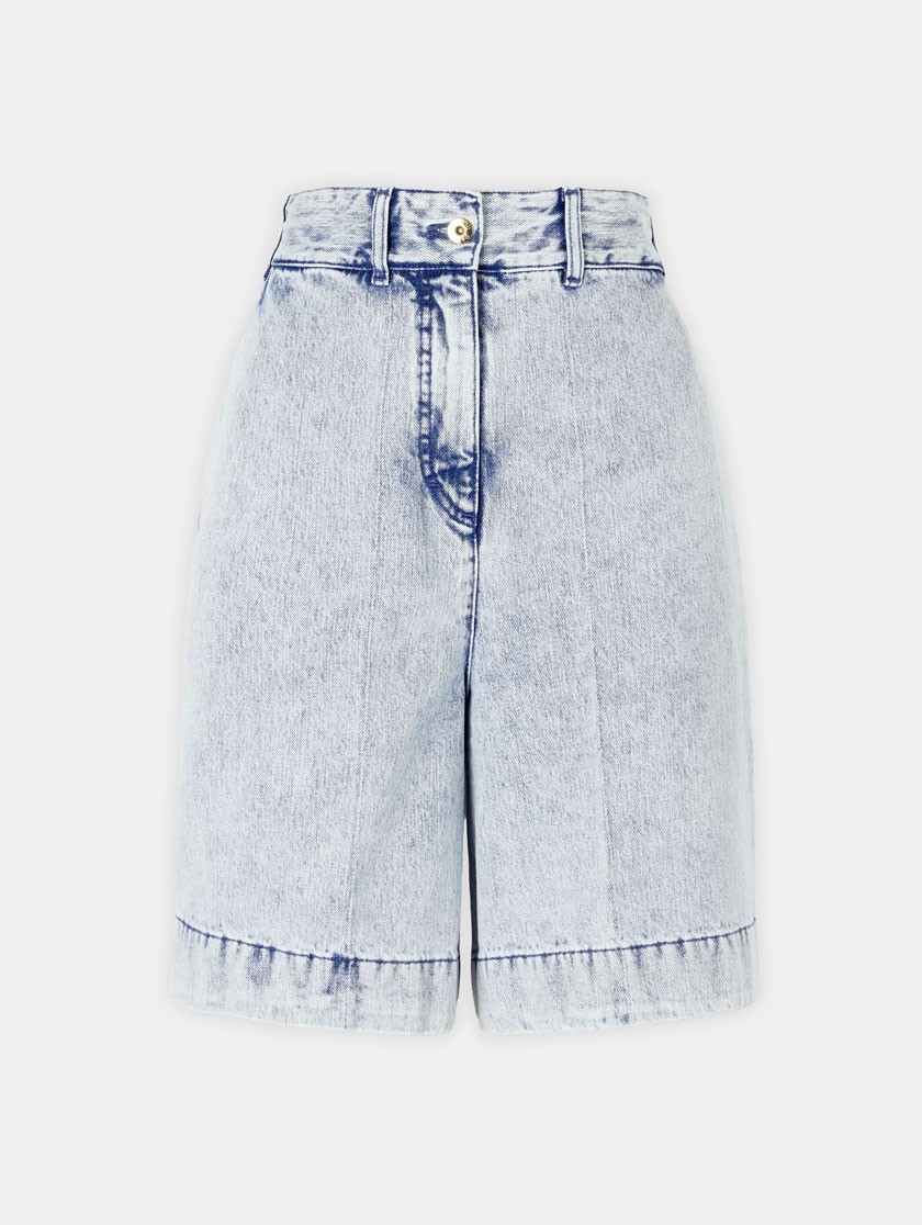 Ce bermuda en jean bleu clair délavé séduit par son allure casual chic et sa coupe moderne. Confectionné dans un denim à la belle tenue, il présente une taille haute et une coupe décontractée, idéale pour un porté confortable au quotidien. Sa longueur genou structure la silhouette, tandis que les surpiqûres apportent une finition soignée. Doté de passants de ceinture, d’une fermeture à bouton et zippée, d’un bouton doré signature, il est rehaussé d’un logo discret au niveau de la taille pour une touche distinctive.