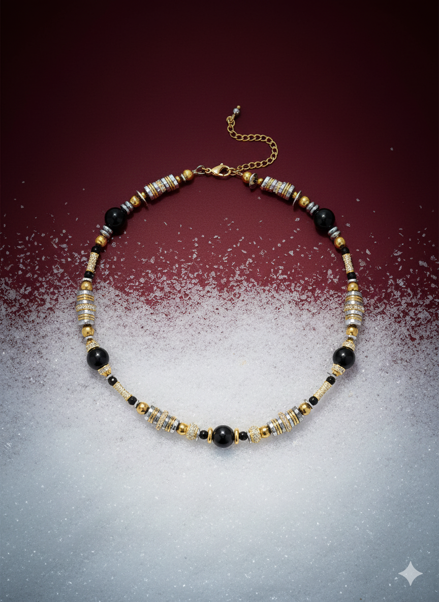 Le collier New Nefertiti Black marie élégamment des perles en obsidienne noire à des éléments dorés et argentés, ponctués d’anneaux sertis de pierres claires pour une touche lumineuse. Confectionné en laiton plaqué or et argent 24 carats, il intègre des perles naturelles et des strass en oxyde de zirconium. Sa longueur de 41,5 cm, ajustable jusqu’à 47,5 cm, en fait un accessoire raffiné et versatile, parfait pour sublimer toutes vos tenues.