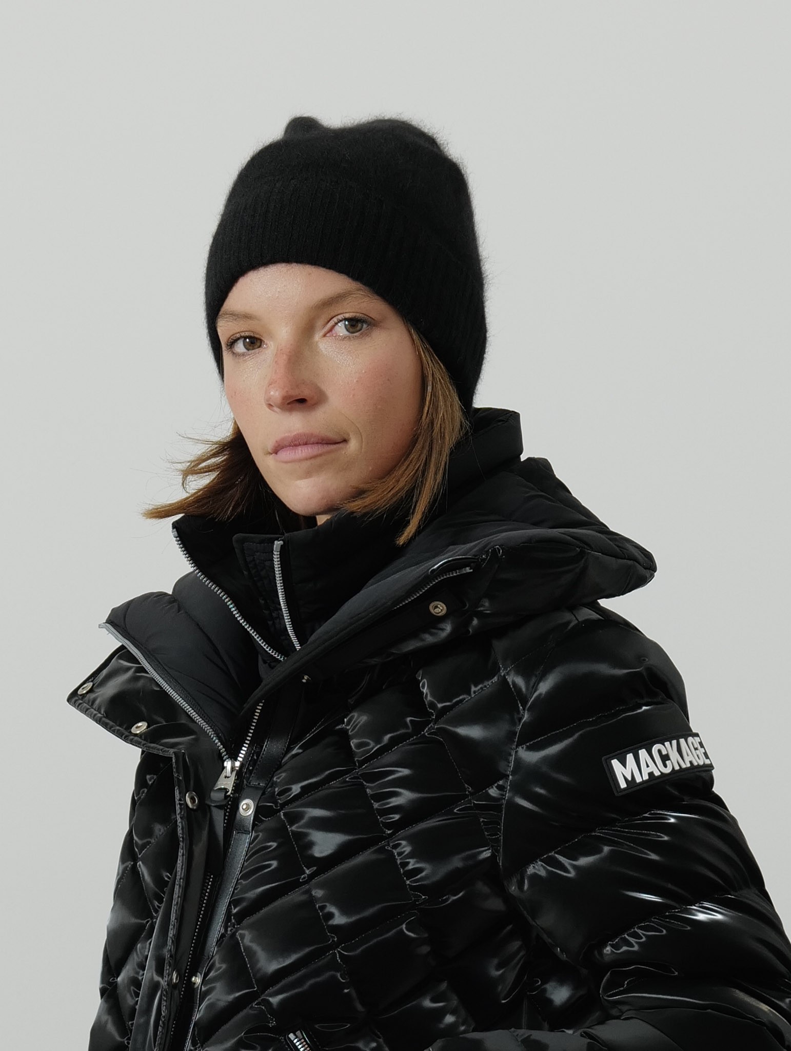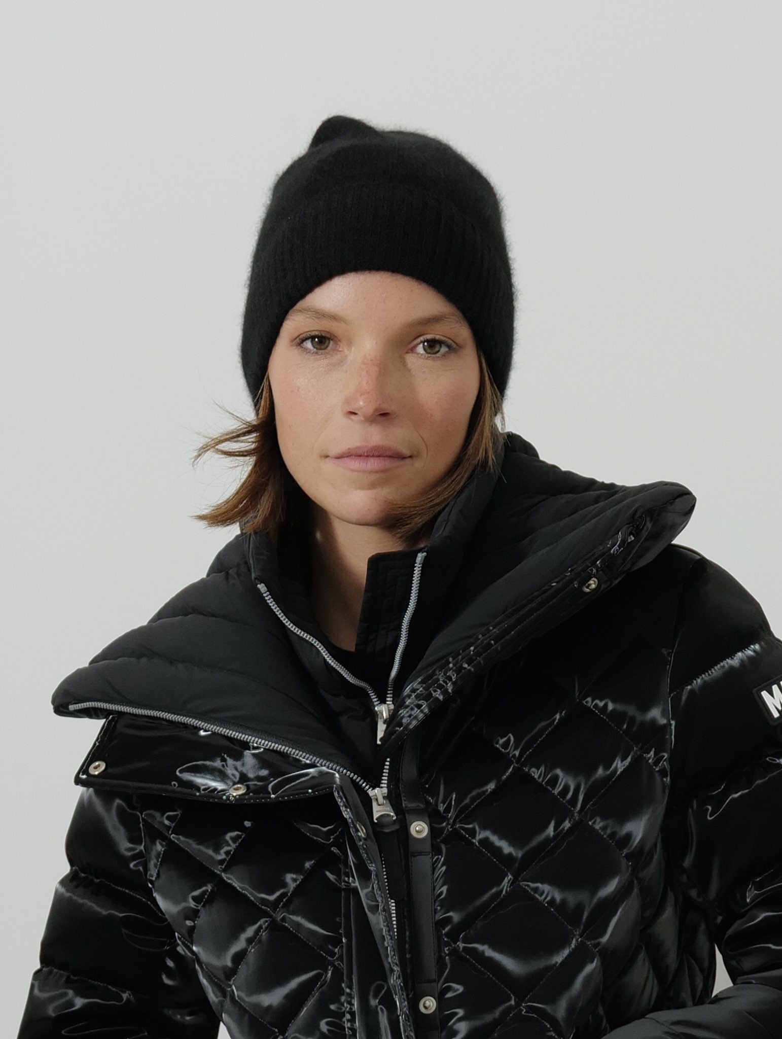 Bonnet noir en raccoon et polyamide, confectionné dans une matière naturelle et douce qui offre chaleur et confort au quotidien.