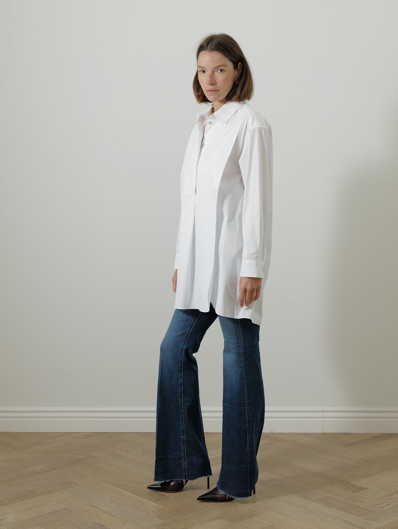 Cette chemise oversize Maison Rabih Kayrouz incarne une élégance moderne et effortless. Confectionnée dans une étoffe blanche lumineuse, elle dévoile un volume maîtrisé qui offre une allure à la fois structurée et décontractée.