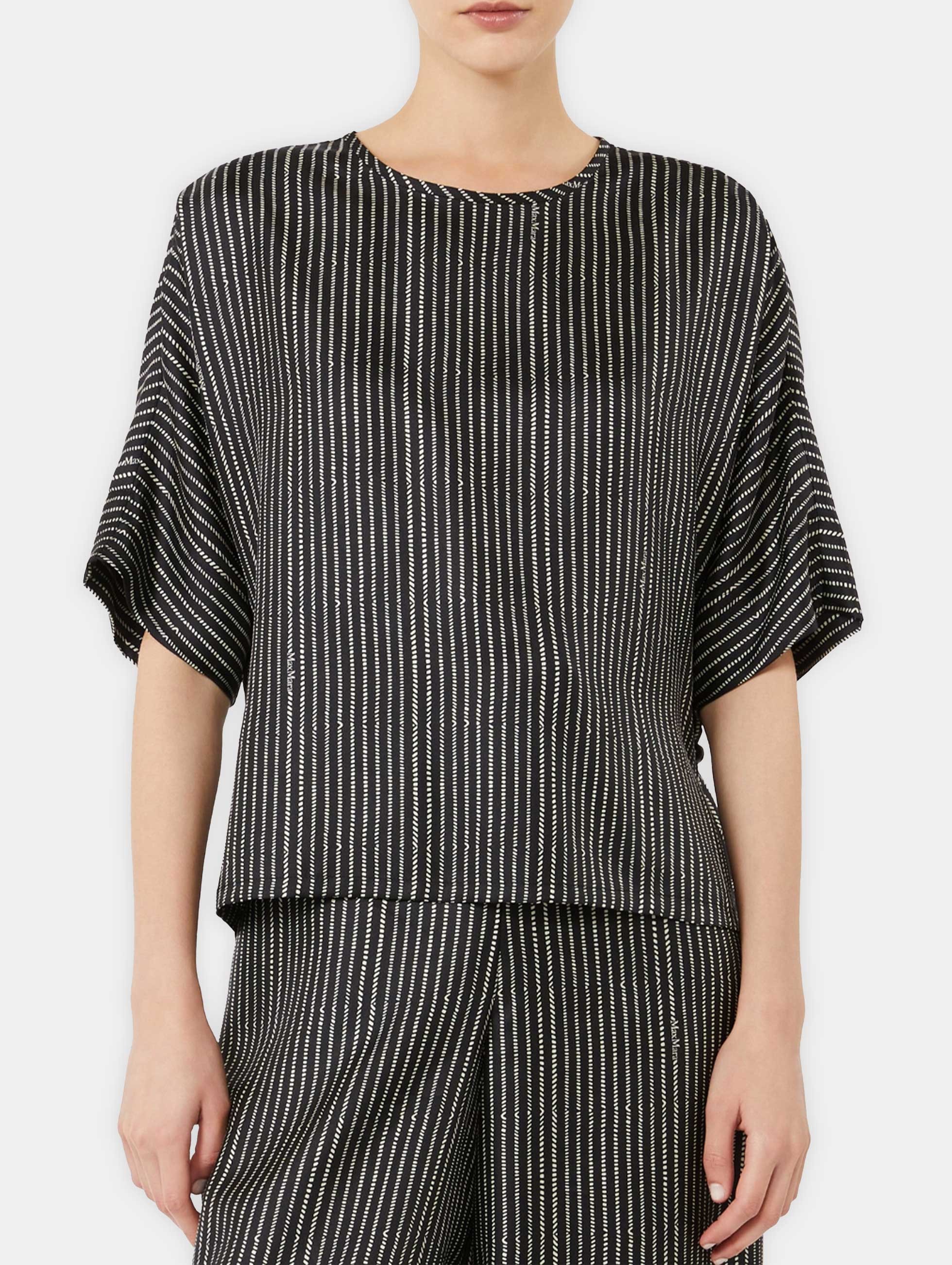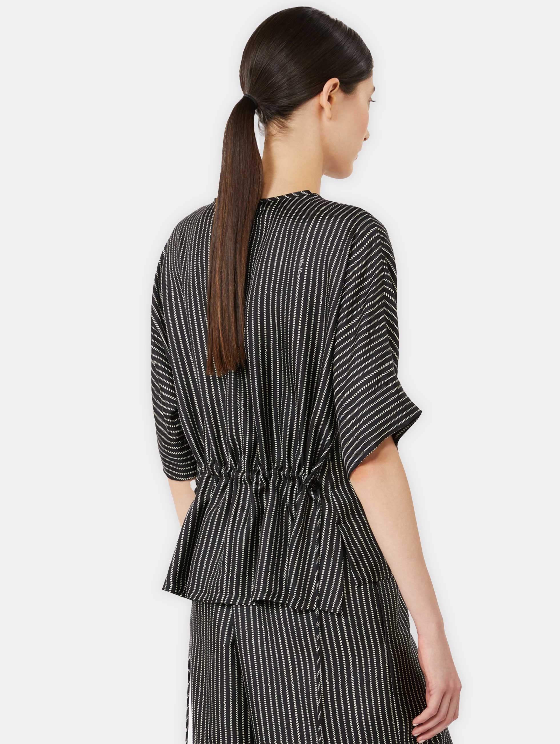Ce chemisier en sergé de pure soie allie confort et sophistication. Sa coupe droite et son col ras-du-cou offrent une silhouette épurée, tandis que les manches courtes kimono apportent liberté et légèreté. Les lacets tubulaires sur les côtés et le cordon de serrage à l’arrière de la taille permettent d’ajuster la silhouette et se parent de détails géométriques subtils. La fermeture goutte d’eau avec bouton au dos complète la pièce avec élégance. Une pièce moderne et raffinée, parfaite pour un look chic et contemporain.