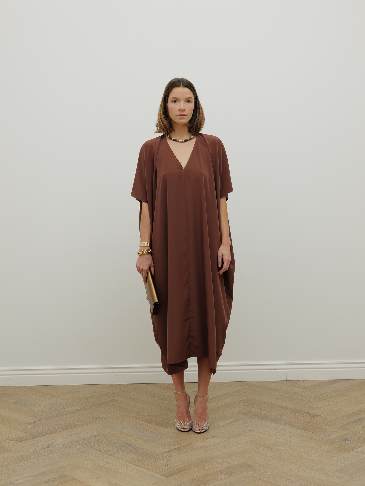 Cette robe kaftan camel, légère, fabriquée en Italie, allie modernité et élégance. Son col en V met en valeur le décolleté avec subtilité, tandis que sa coupe fluide assure confort et facilité de porter au quotidien. Une pièce chic et polyvalente, parfaite pour un look estival ou une occasion élégante, alliant style et praticité.