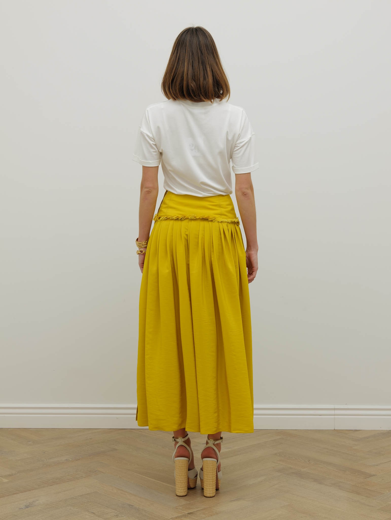 Cette jupe revisite avec subtilité les volumes emblématiques des Robes de Style imaginées dans les années 1920 par Jeanne Lanvin, elles-mêmes inspirées des silhouettes Empire du XVIIIe siècle.