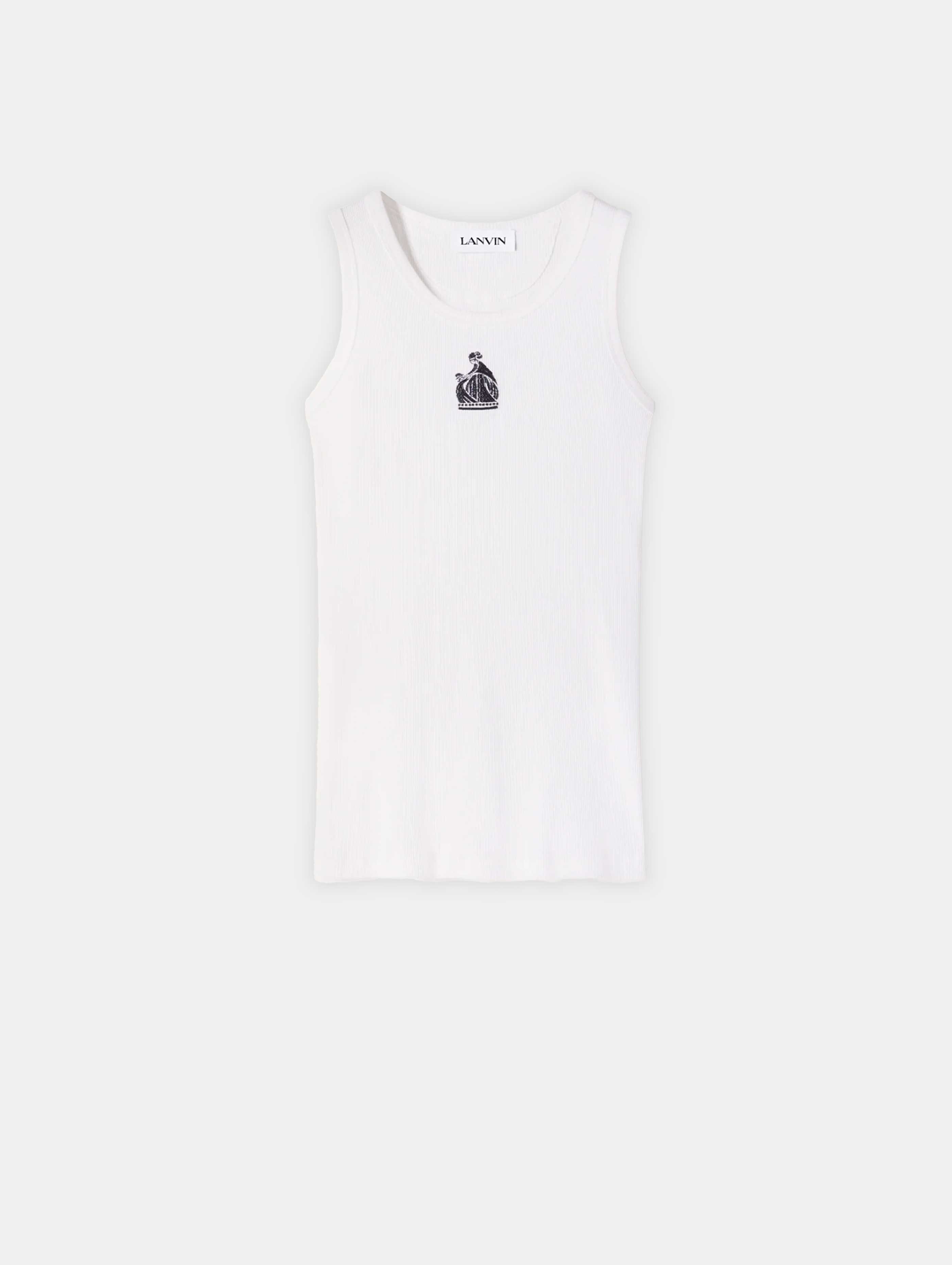 Ce débardeur rend hommage au logo emblématique La Mère et l’Enfant, imaginé au début des années 1920 par Jeanne Lanvin pour célébrer l’amour inconditionnel qu’elle portait à sa fille Marguerite. À l’époque, cette signature symbolisait la volonté de la Maison d’habiller avec la même élégance les mères et leurs enfants.