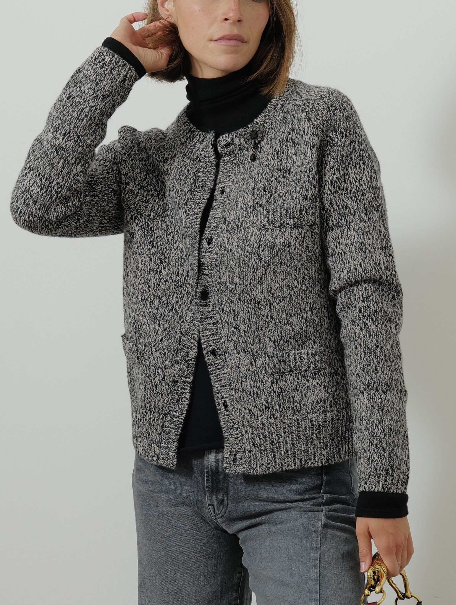 Ce cardigan féminin à coupe droite est confectionné en laine et cachemire mouliné bicolore, offrant douceur et confort. Son col rond se pare d’une broderie amovible ornée de bijoux, tandis que les manches longues raglan et les finitions côtelées soulignent une silhouette raffinée. La fermeture discrète à boutons en nacre mate et les quatre rabats décoratifs sur le devant apportent une touche de sophistication subtile.