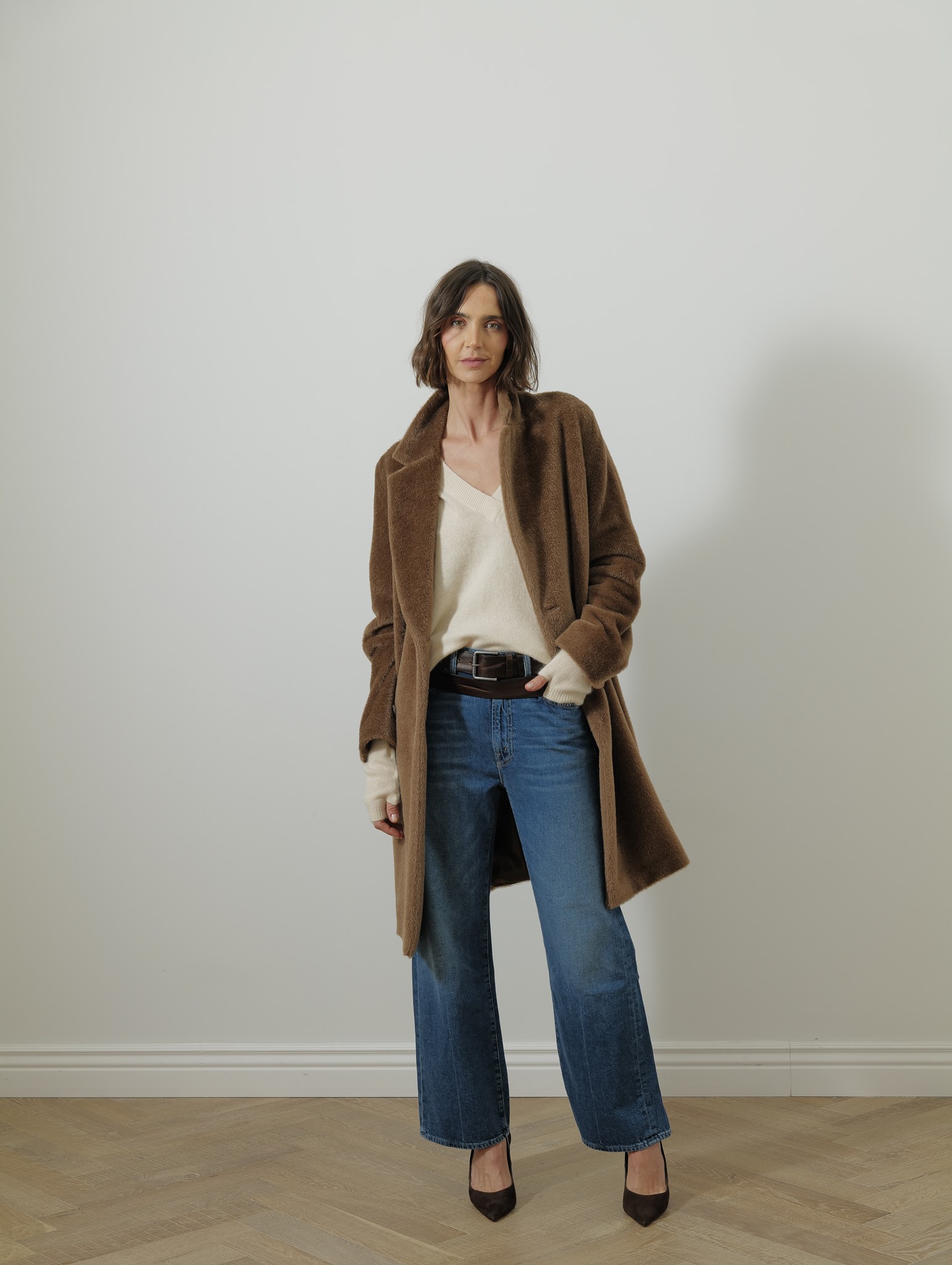 Ce manteau mi-long en mélange d’alpaga et de laine à poils courts se distingue par son coloris beige foncé aux reflets gris subtils. Sa coupe droite ample et son col tailleur lui confèrent une allure élégante et intemporelle. Il présente une fermeture croisée à double boutonnage, deux poches latérales pratiques et une base droite, parfait pour conjuguer chaleur et raffinement.