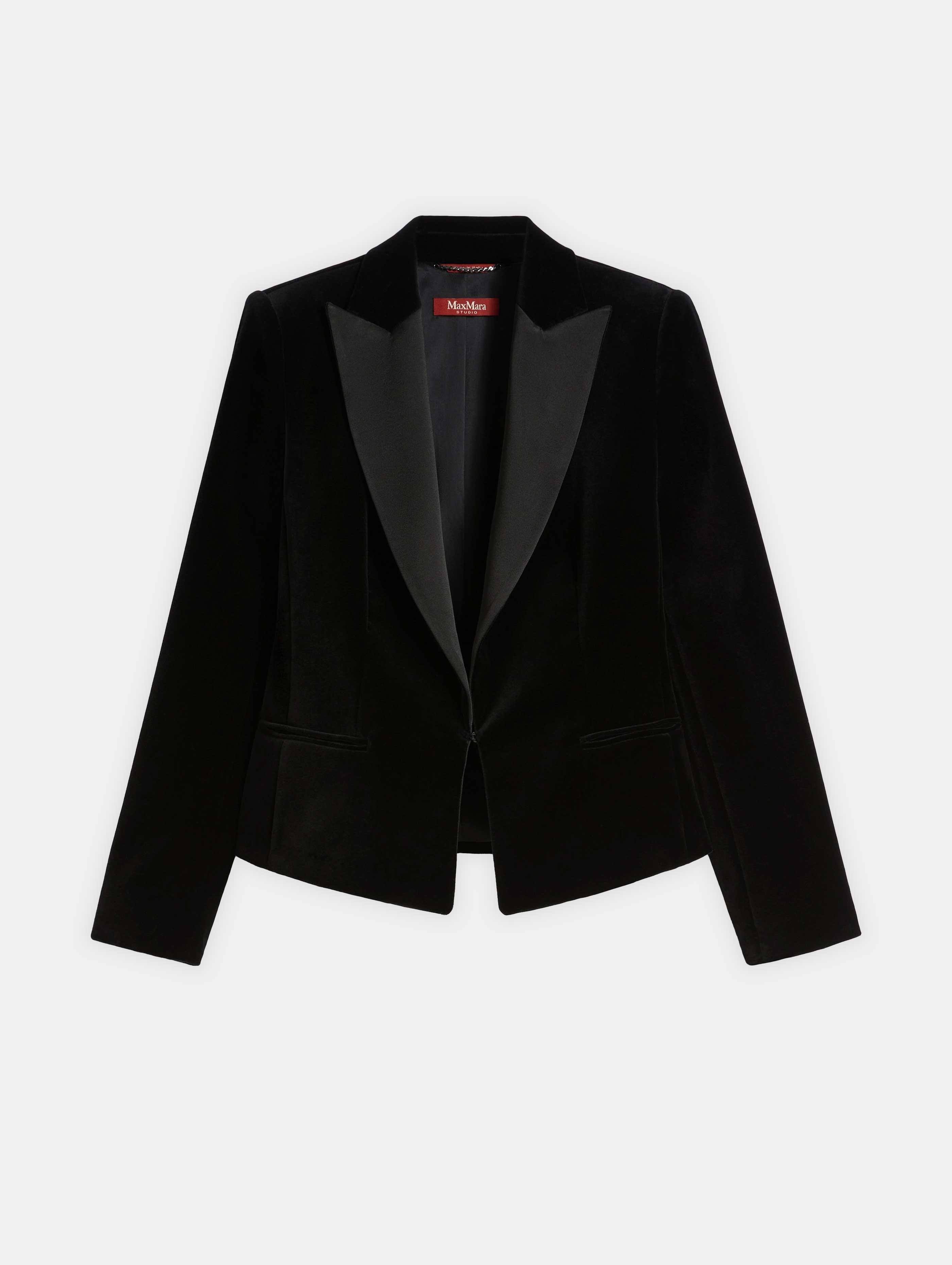 Cette veste courte en velours lisse de coton stretch revisite le smoking avec une allure féminine et raffinée. Sa coupe ajustée, travaillée avec précision, met la silhouette en valeur tandis que le col à revers en pointe souligné de satin apporte une touche d’élégance. Les manches montées ornées de boutons recouverts, les poches passepoilées et la doublure soignée témoignent d’un savoir-faire couture et d’une finition luxueuse.