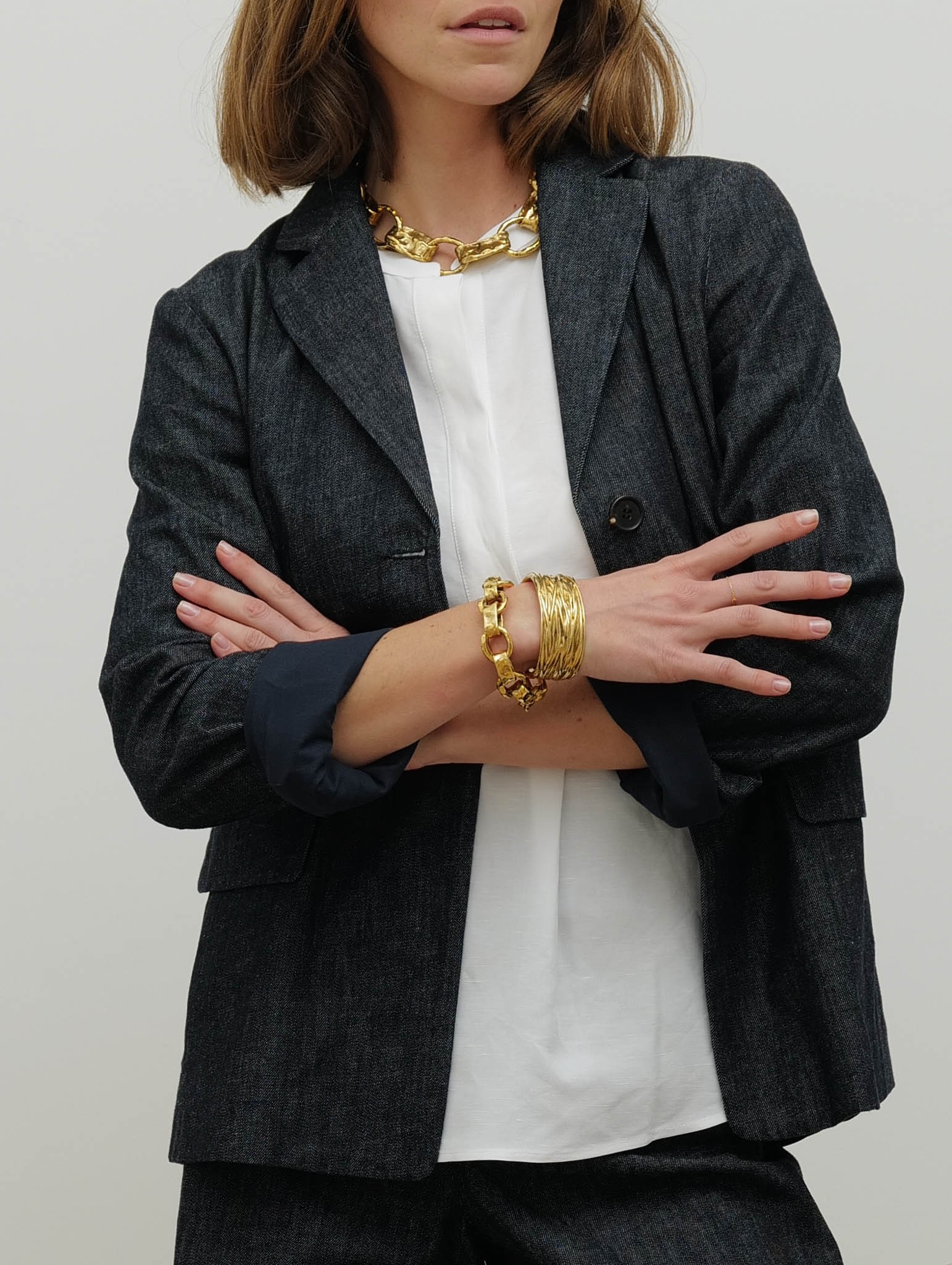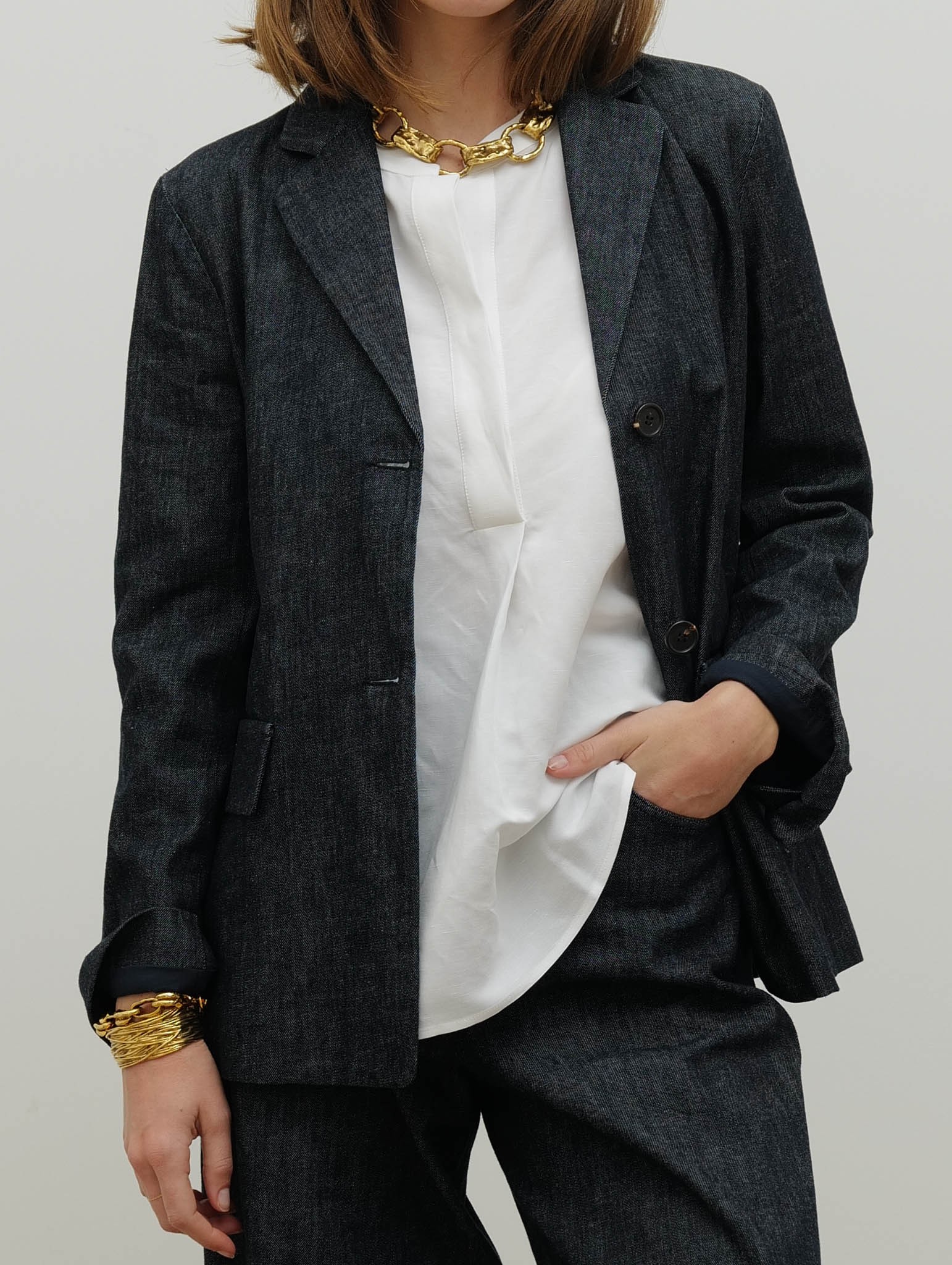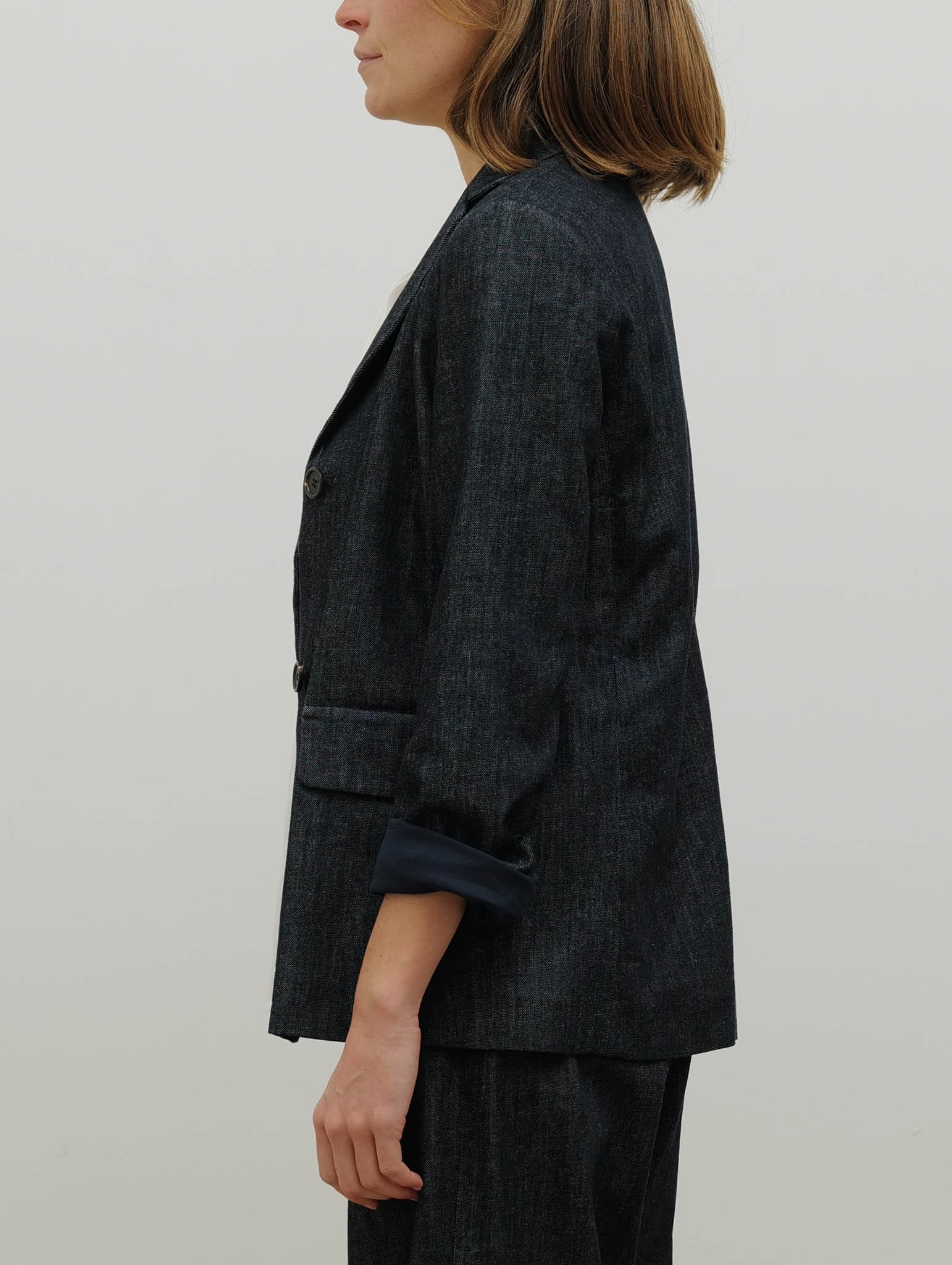 Cette veste droite en denim de coton stretch délavé allie structure et confort. Son col à revers et ses manches montées avec petites fentes aux poignets apportent une finition soignée, tandis que la fermeture à deux boutons apparents sur le devant souligne son style classique et élégant. Les poches passepoilées avec rabat et la fente centrale au dos complètent la pièce, offrant fonctionnalité et mouvement. Entièrement doublée en coton, elle assure confort et tenue parfaite au quotidien.