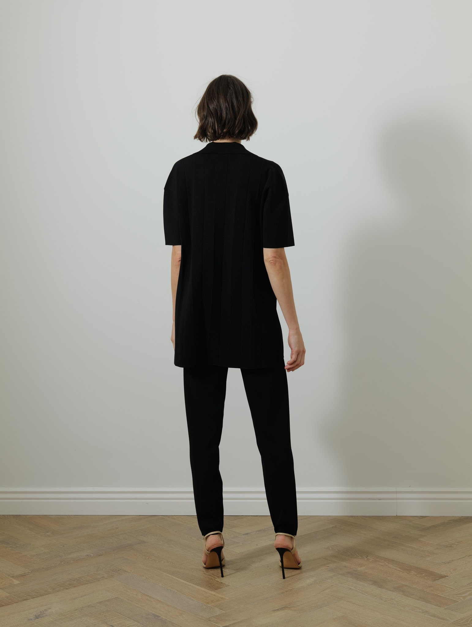 Ce chemisier associe élégance et modernité grâce à son jeu de textures : une maille unie sur le devant et un dos à effet plissé. Confectionné en fil de viscose crêpe issue de sources responsables, il présente une coupe droite, un petit col polo ouvert et un col en V prolongé par un lien tubulaire à extrémités métalliques. Les fentes latérales complètent ce modèle fluide et léger, parfait pour une allure raffinée et décontractée.