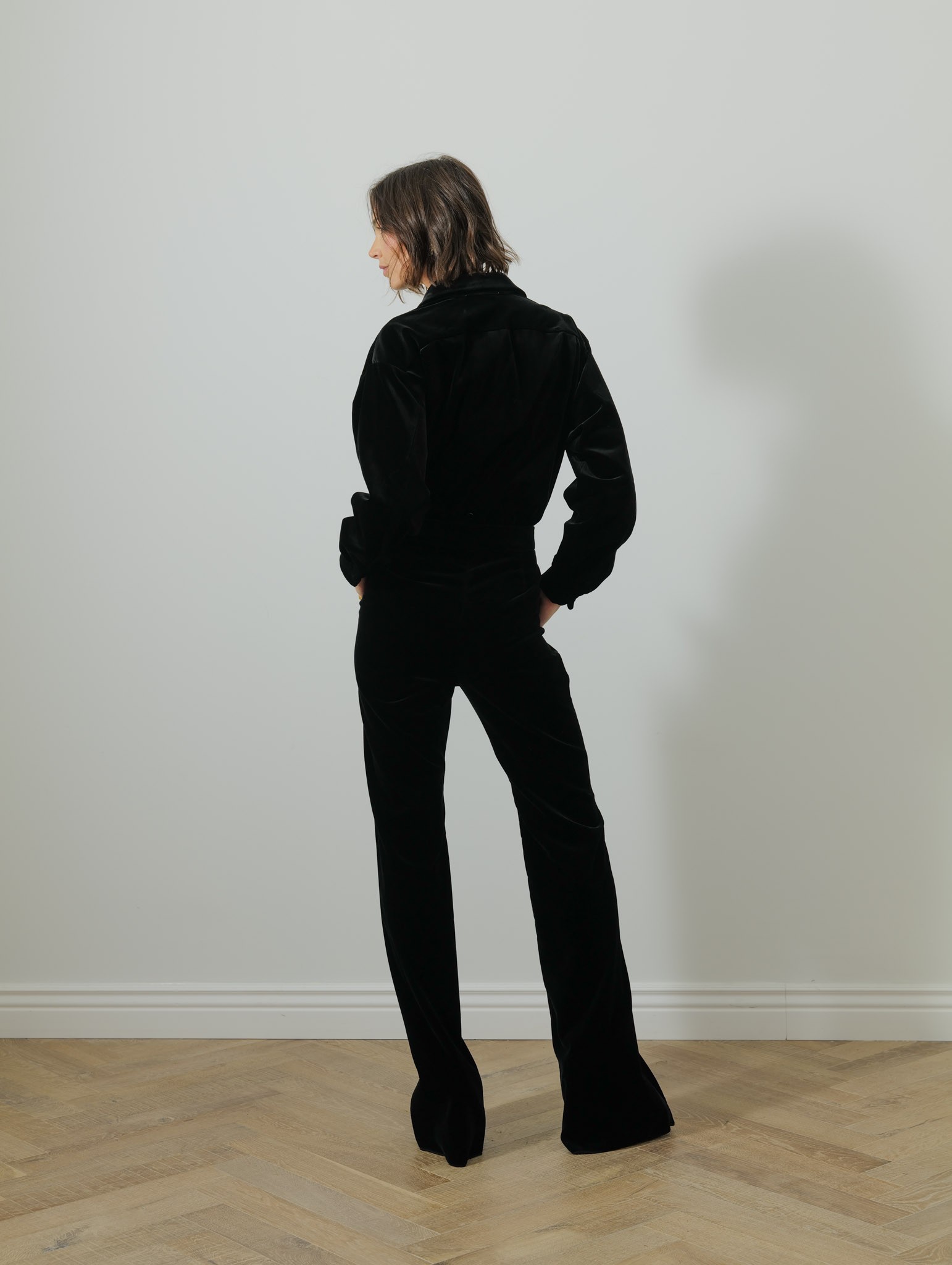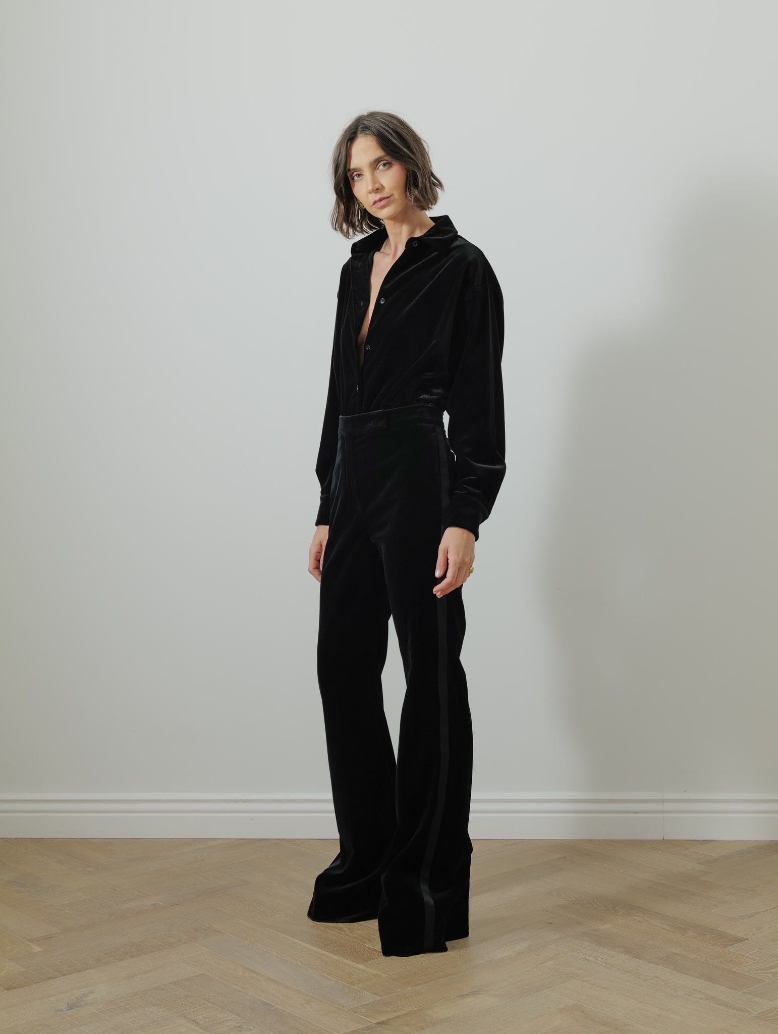Ce pantalon de smoking aux lignes classiques et raffinées est confectionné en velours de coton stretch lisse, sublimé par une bande latérale en satin envers. Sa coupe régulière à jambe ample et sa taille haute fermée par zip et crochet dissimulés allient confort et élégance. Des poches insérées sur les côtés et un pli marqué viennent parfaire son allure intemporelle.