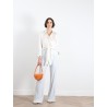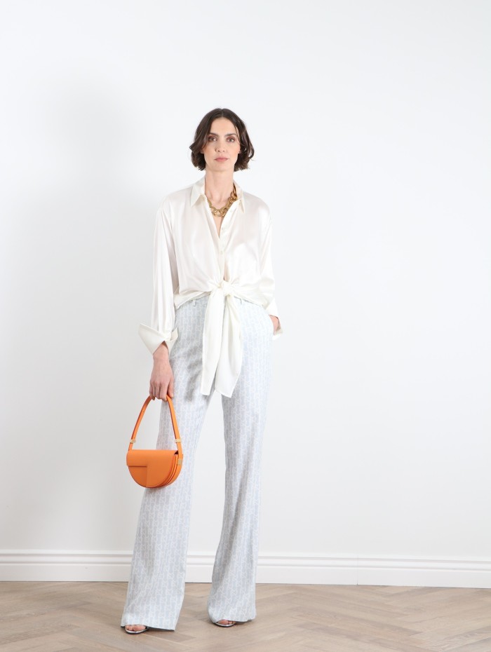 Plongez dans l'audace rétro-chic avec le pantalon pattes d'éléphant bleu ciel monogramé en blanc par DMN. Ce pantalon incarne l'esprit des années 70 avec une touche contemporaine, grâce à son motif monogramme distinctif et sa teinte bleu ciel rafraîchissante.