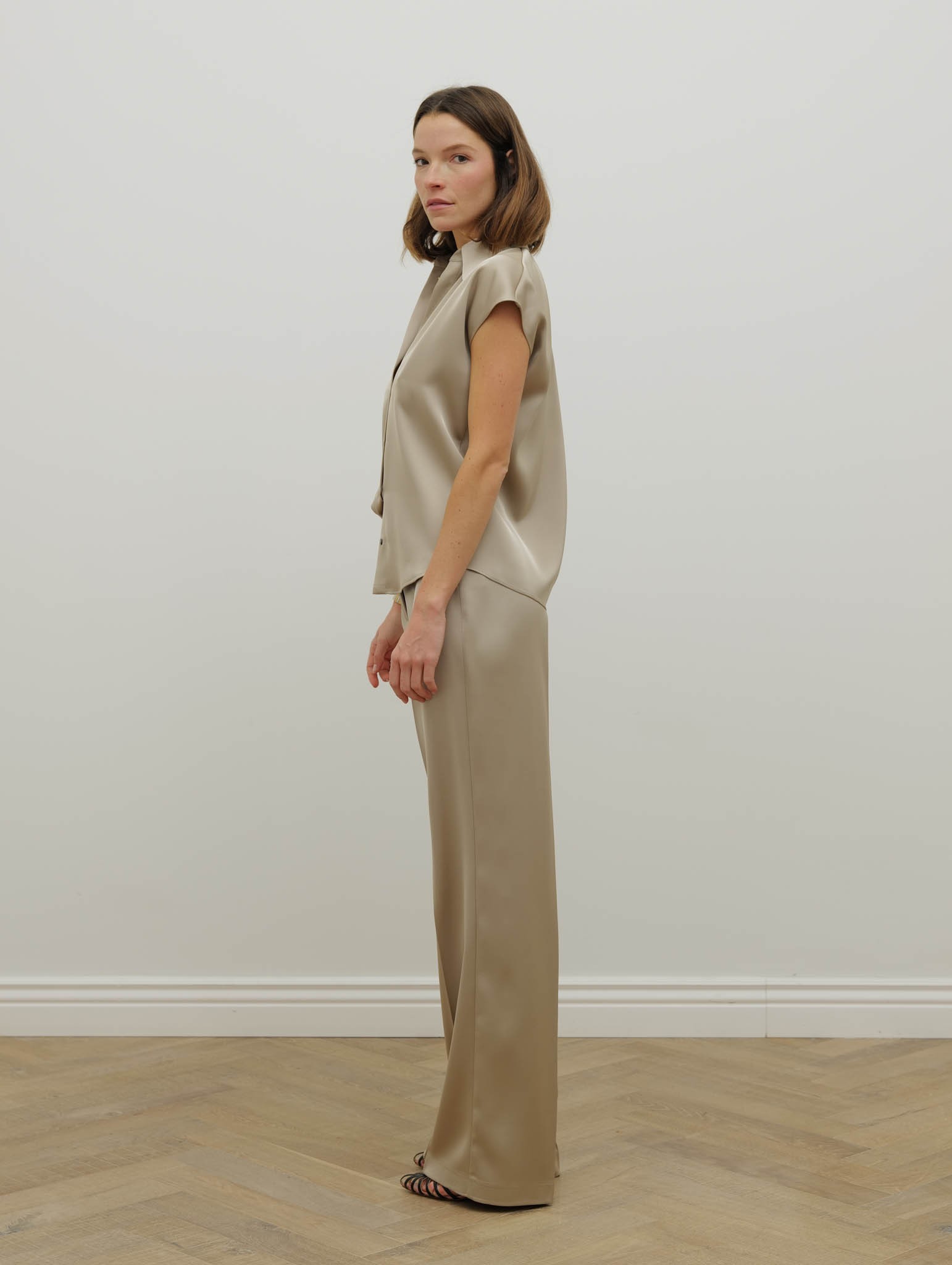 Pantalon 26 Avenue fluide en effet satiné sable, long et large pour un tombé élégant sur la chaussure. Fermeture zippée et bouton caché pour un rendu épuré. Deux plis marqués sur chaque jambe apportent structure et fluidité au mouvement.
