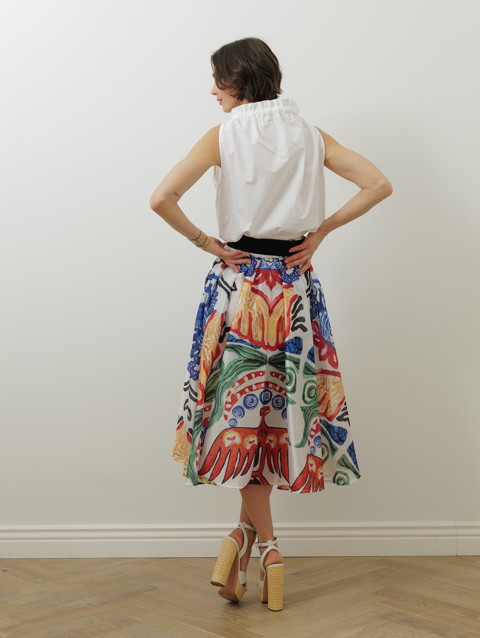 Cette jupe séduit par son imprimé végétal coloré, apportant fraîcheur et vitalité à la silhouette. Sa coupe ample et aérienne offre un tombé fluide, idéal pour un look estival élégant et confortable.