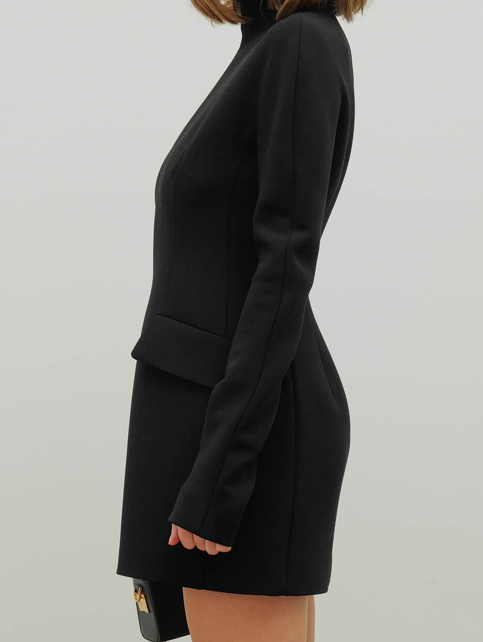 Cette robe en double gabardine de laine technique stretch se distingue par sa coupe en forme de sablier, ajustée à la taille et délicatement arrondie au niveau des hanches. Les pinces profondes et les découpes centrales sculptent la silhouette en créant une succession de lignes féminines et structurées. Le col montant, les manches kimono et la fermeture zippée au milieu du dos renforcent l’allure contemporaine de cette pièce élégante, complétée par des poches latérales à rabat. Une robe au style affirmé, pensée pour sublimer la silhouette.