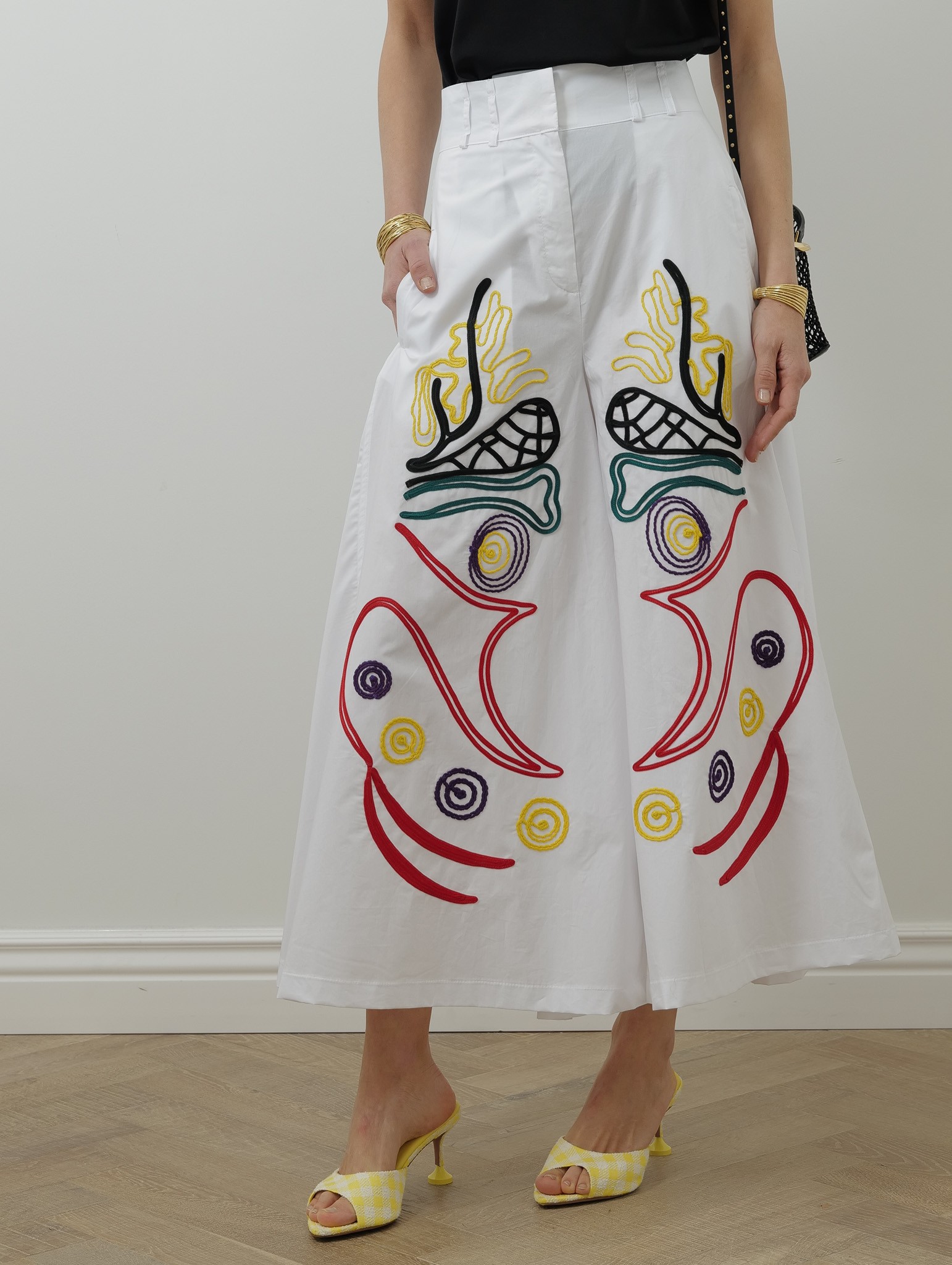 Les broderies colorées au style graphique apportent une touche artistique et contemporaine, faisant de cette pièce un véritable statement. Facile à porter, il se marie parfaitement avec un top sobre pour laisser toute la place à ses détails.