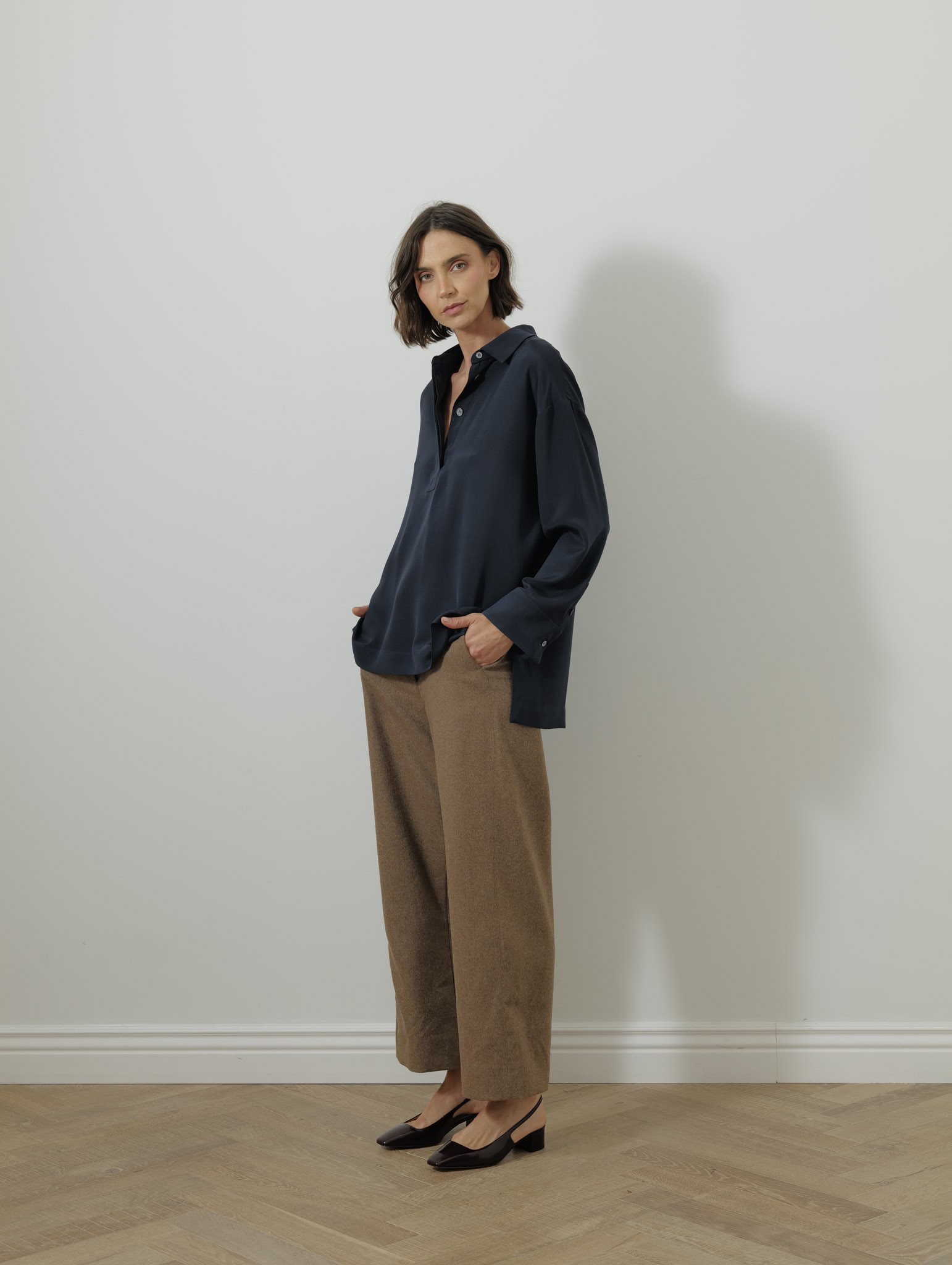 Cette chemise à la coupe fluide séduit par son élégance décontractée et son bas asymétrique, légèrement plus long dans le dos. Confectionnée en crêpe de Chine de pure soie stretch, elle offre une sensation de légèreté et de confort. Son petit col polo s’ouvre sur une patte de boutonnage discrète, avec boutons dissimulés pour une finition épurée. Les manches longues à épaules tombantes renforcent son allure souple, tandis que les poignets de chemise sont délicatement fermés par de petits boutons en nacre. Des fentes latérales carrées apportent une touche contemporaine à ce modèle raffiné.