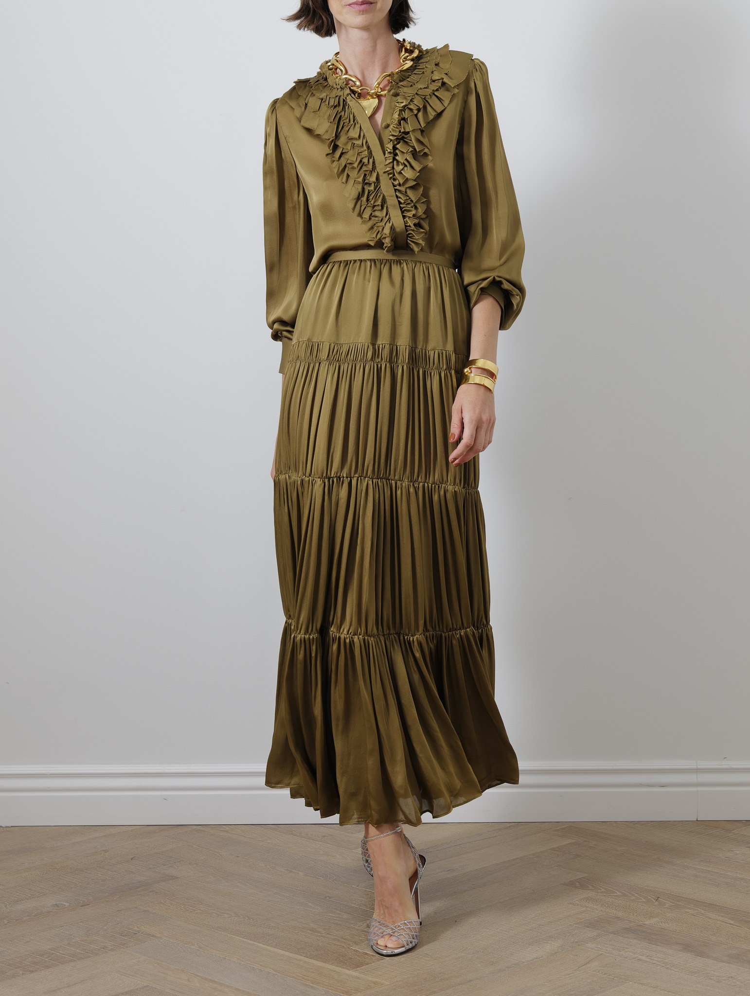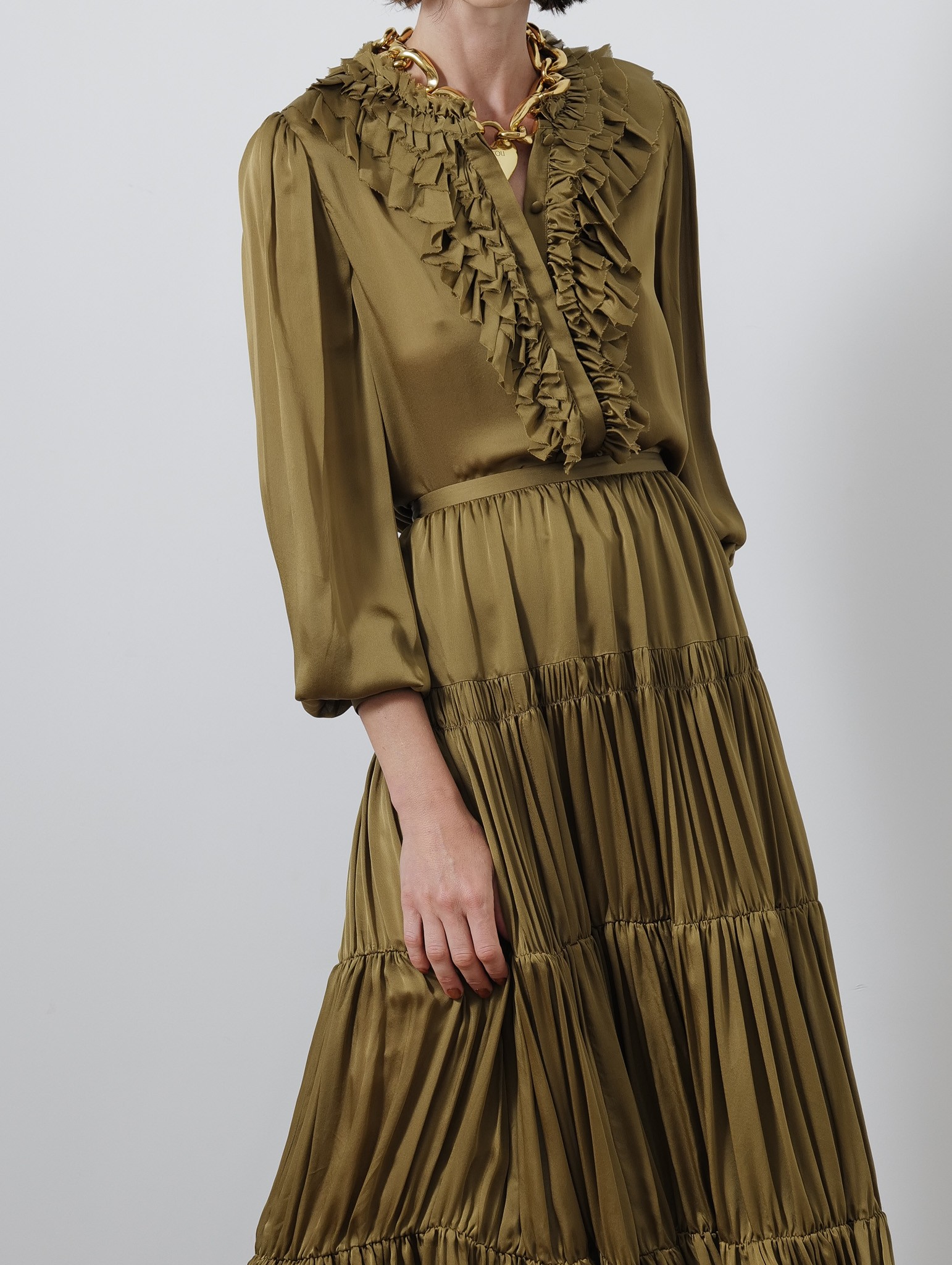 La blouse Rouen est confectionnée en chiffon de soie satiné léger doté d’un subtil éclat. Ce haut vert olive se distingue par ses manches longues froncées au volume élégant et ses volants superposés riches en détails. Les poignets sont boutonnés et la fermeture sur le devant est discrètement cachée pour un fini raffiné.