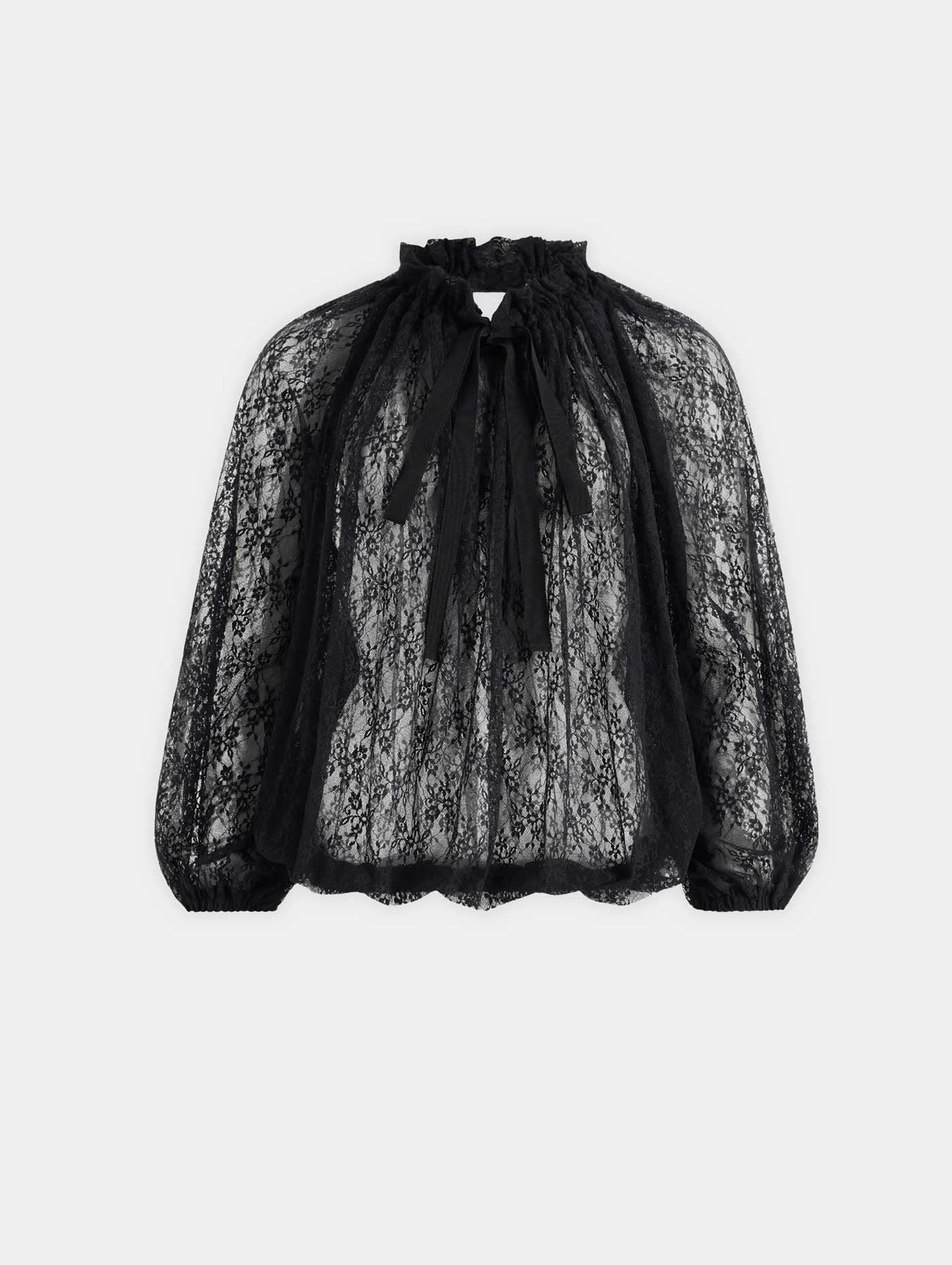 Ce haut en dentelle délicate noire séduit par son col montant orné d’un lien de resserrage et ses manches ballon romantiques. Une pièce raffinée qui associe élégance intemporelle et détails féminins.